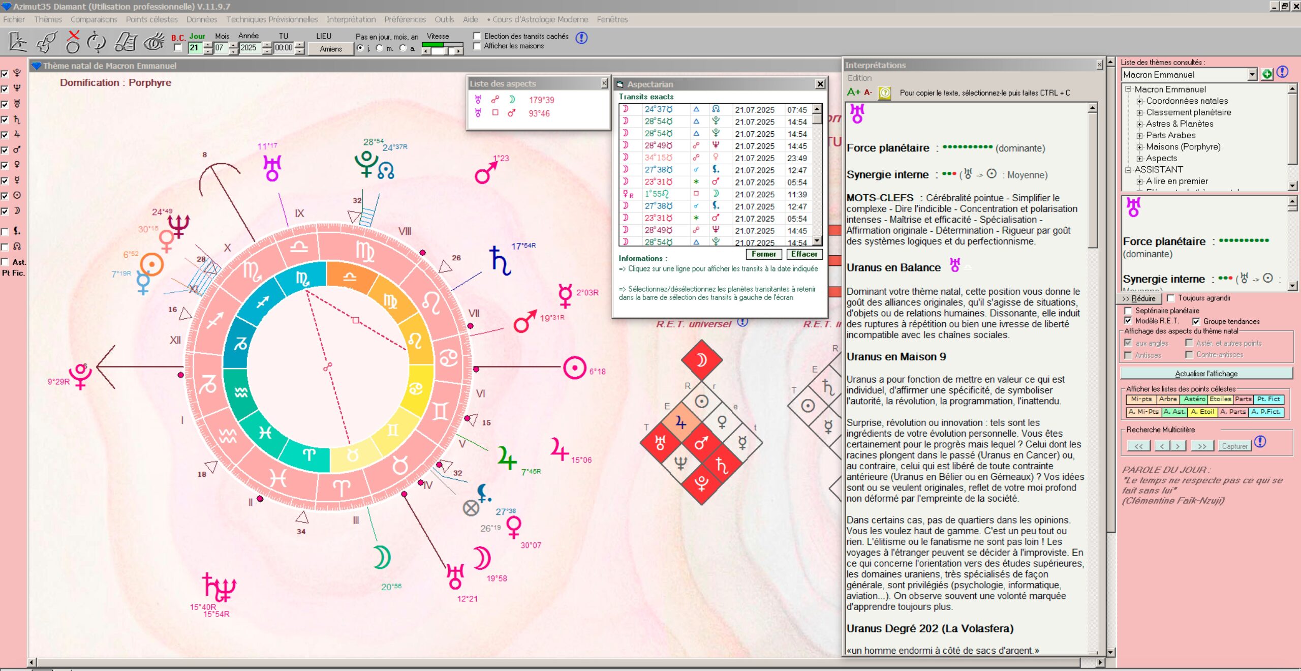 À cela s’ajoutent les révolutions solaires et lunaires, les directions symboliques, les progressions secondaires et tertiaires, et même l’astrocartographie. En version Diamant, les cartes peuvent être géolocalisées pour déterminer les lieux les plus favorables selon la configuration céleste.